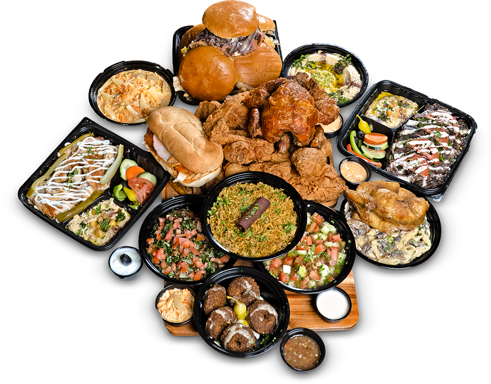 Mandi rice, fries, coleslaw, garlic sauce, buns, hummus